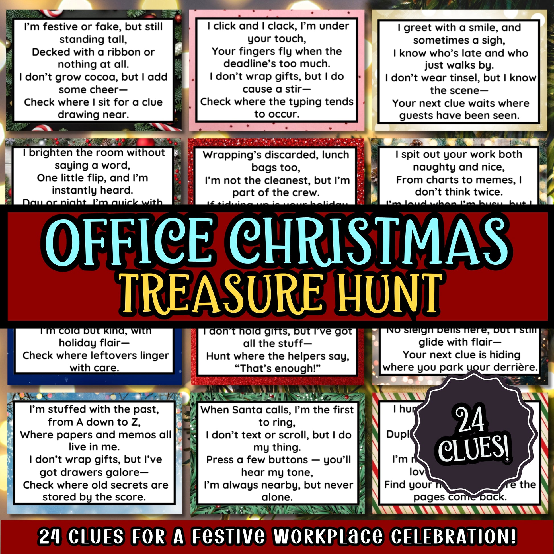 - 24 festive clue cards written just for work settings
